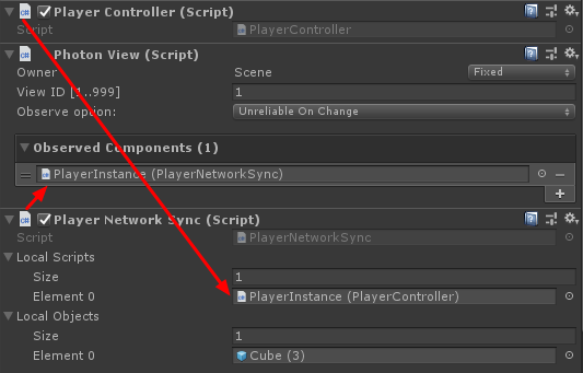 }- PlayerNetworkSync.cs betiğini PlayerInstance'a ekleyin ve onu PhotonView Observed Components'a atayın.
