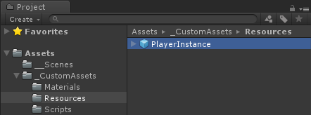 - PlayerInstance'ı Prefab'a kaydedin ve Kaynaklar adlı klasöre taşıyın (Böyle bir klasör yoksa bir tane oluşturun). Bu adım, Ağ üzerinden çok oyunculu Nesneler oluşturabilmek için gereklidir.