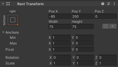 - "JoystickRight" Rect Transform değerlerini aşağıdaki ekran görüntüsündekiyle aynı şekilde ayarlayın: