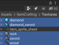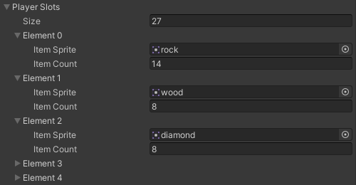 Her yuvaya bir öğe eklemek için "Item Sprite" değişkenine bir öğe Sprite atamamız ve "Item Count"'i herhangi bir pozitif sayıya ayarlamamız gerekir (1'in altındaki her şey ve/veya istiflenemeyen öğeler 1 olarak yorumlanacaktır):
