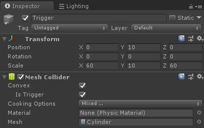 - "Trigger" GameObject'e MeshCollider bileşenini ekleyin, Convex ve IsTrigger onay kutularını işaretleyin ve Mesh'i varsayılan Silindir olarak değiştirin
