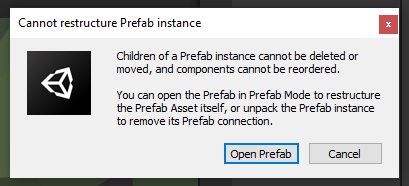 - Prefabrik'i doğrudan sahnede düzenlerken bazı eylemler desteklenmez; örneğin, hiyerarşiyi yeniden yapılandırmanız gerekiyorsa "Cannot restructure Prefab instance" mesajı ve "Open Prefab" veya "Cancel" seçenekleri sunulur.