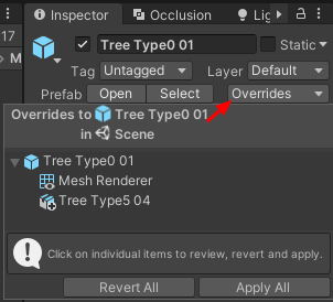 - Sahnede prefabrikleri değiştirirken, değişiklikler otomatik olarak kaydedilmez; bunun yerine, Prefab'ın kök nesnesini manüel olarak seçmeniz ve Denetçi Görünümü'nde değişiklikleri kaydetmek için "Overrides"'e ve ardından "Apply All"'e veya *h25'e tıklamanız gerekir. * Değişiklikleri geri almak için.